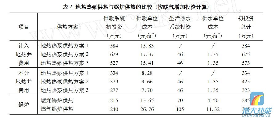表1列出了不同采暖終端,新鉆地熱井系統的投資和單位運行成本的計算結果。從三種地熱供熱方案看,方案1的投資低,供暖成本也低,但沒有生活熱水供應。綜合比較,方案3既有供暖,又有生活熱水供應,同時還兼顧夏季空調,運行成本最低,投資費用處在方案1和方案2之間,可作為優選方案。