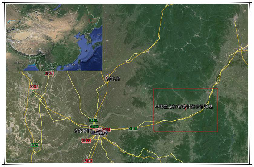 通河縣位于黑龍江省中部,小興安嶺南麓,松花江中游北岸,地理坐標東經128°7′30″—129°24′30″,北緯45°52′30″—46°37′30″之間。東與依蘭縣為鄰,西與木蘭縣毗鄰,南與松花江為界與方正、賓縣隔江相望,北以平頂山分水嶺為界與鐵力市、慶安縣接壤。通河全境東西長約89.7公里,南北寬約87公里,幅員面積5678公里。通河縣北部山區,屬小興安嶺山脈。最高峰海拔1100米,一般海拔平均400-800米。最大坡度70°,溝壑峽谷多呈V型。成土母質屬于基巖、沖積堆積物。其地殼厚度可達70公里,為上、下兩層,上層為花崗巖,由于富含硅和鋁,又稱硅鋁層。下層為玄武巖,富于含硅和鎂,也叫硅鎂層。地殼表層因受大氣、水、生物作用,形成土壤層、風化殼和沉積層,厚度介于0-10公里之間,占總面積的70%,中部丘陵和淺山區,山勢平緩,峽谷開闊。一般平均海拔在200-500米之間,山頂坡度40°以上,坡降15°-20°左右。物理風化作用較強,成土母質屬于殘積物和坡積物。丘陵屬于中山區。南部與山前臺地緊緊相連,分布在山區外圍,呈海拔200米左右丘陵,下屬寬闊小平原,土質肥沃,都已開墾成耕地,丘陵上適宜造林和發展果樹生產。丘陵下部往南延伸趨近于松花江北岸屬于山前臺地高平原區。